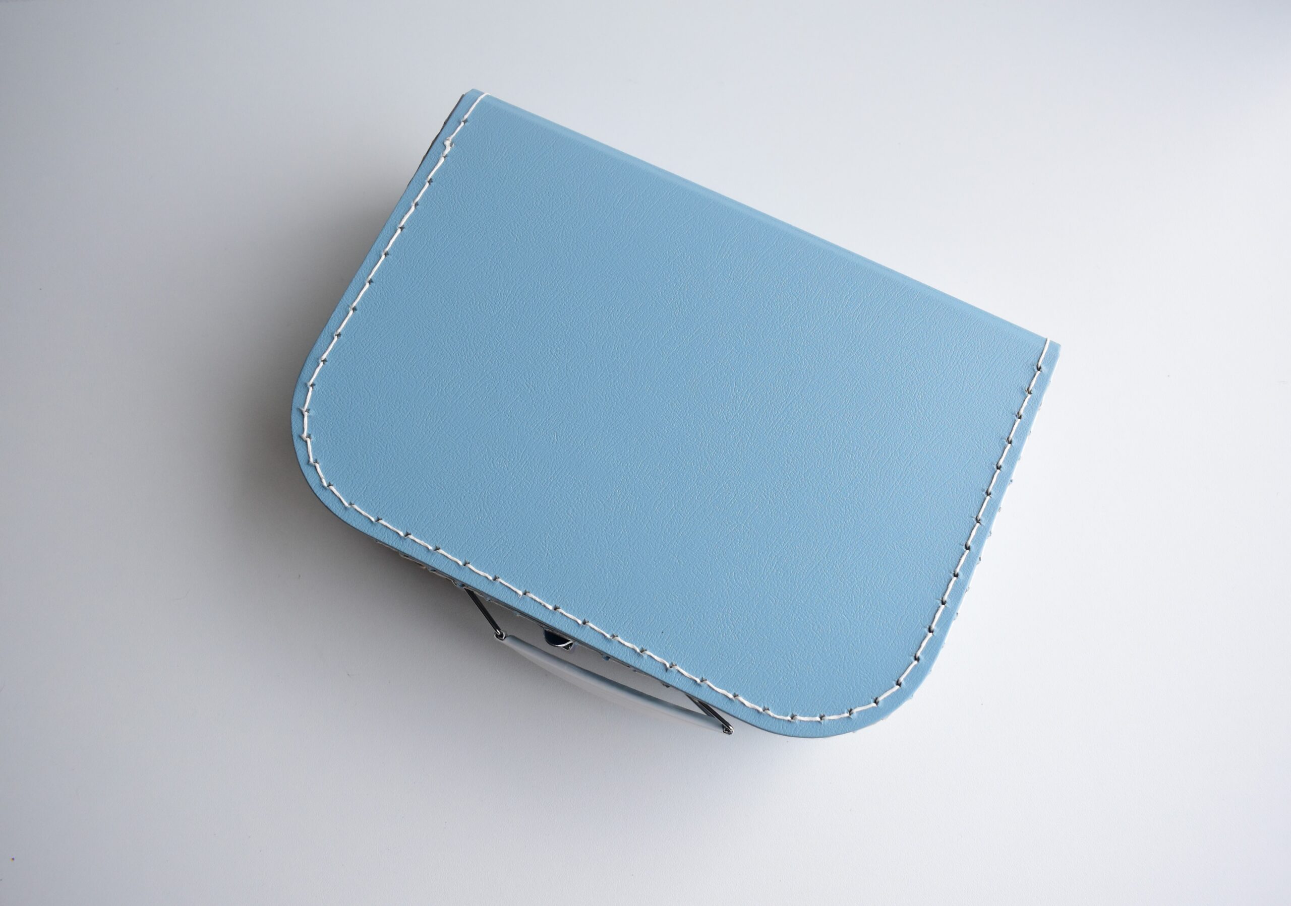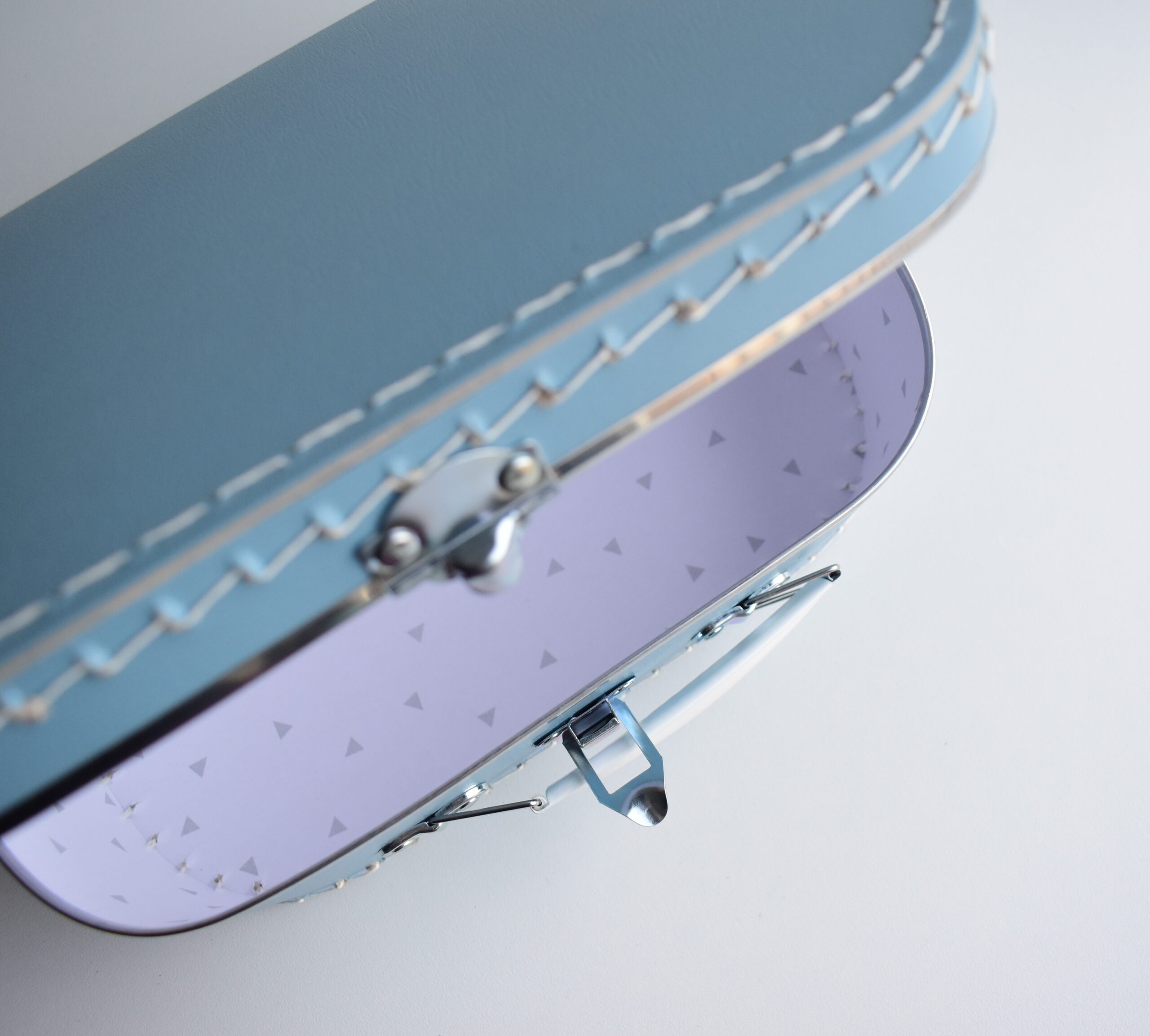 Dit stoere jeansblauwe geboortekoffertje met witte stiksels voorzien van de geboortegegevens van de baby, is een super leuk kraamcadeautje!