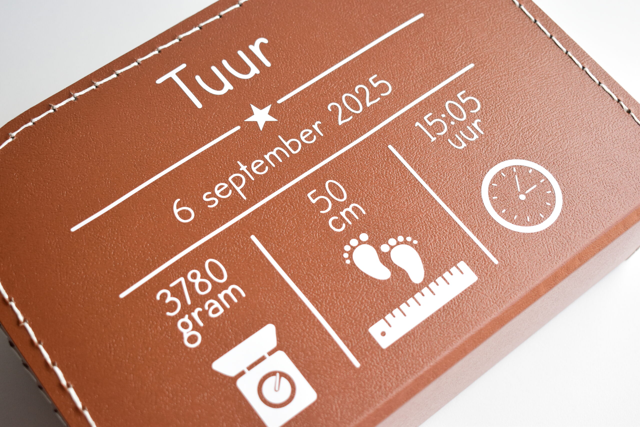 De teksten worden met permanent wit vinyl op het koffertje geplaatst. De gegevens die ik nodig heb, om het koffertje te personaliseren, zijn de naam en eventuele doopnamen, de geboortedatum, het tijdstip, het gewicht en de lengte van de baby in centimeters.