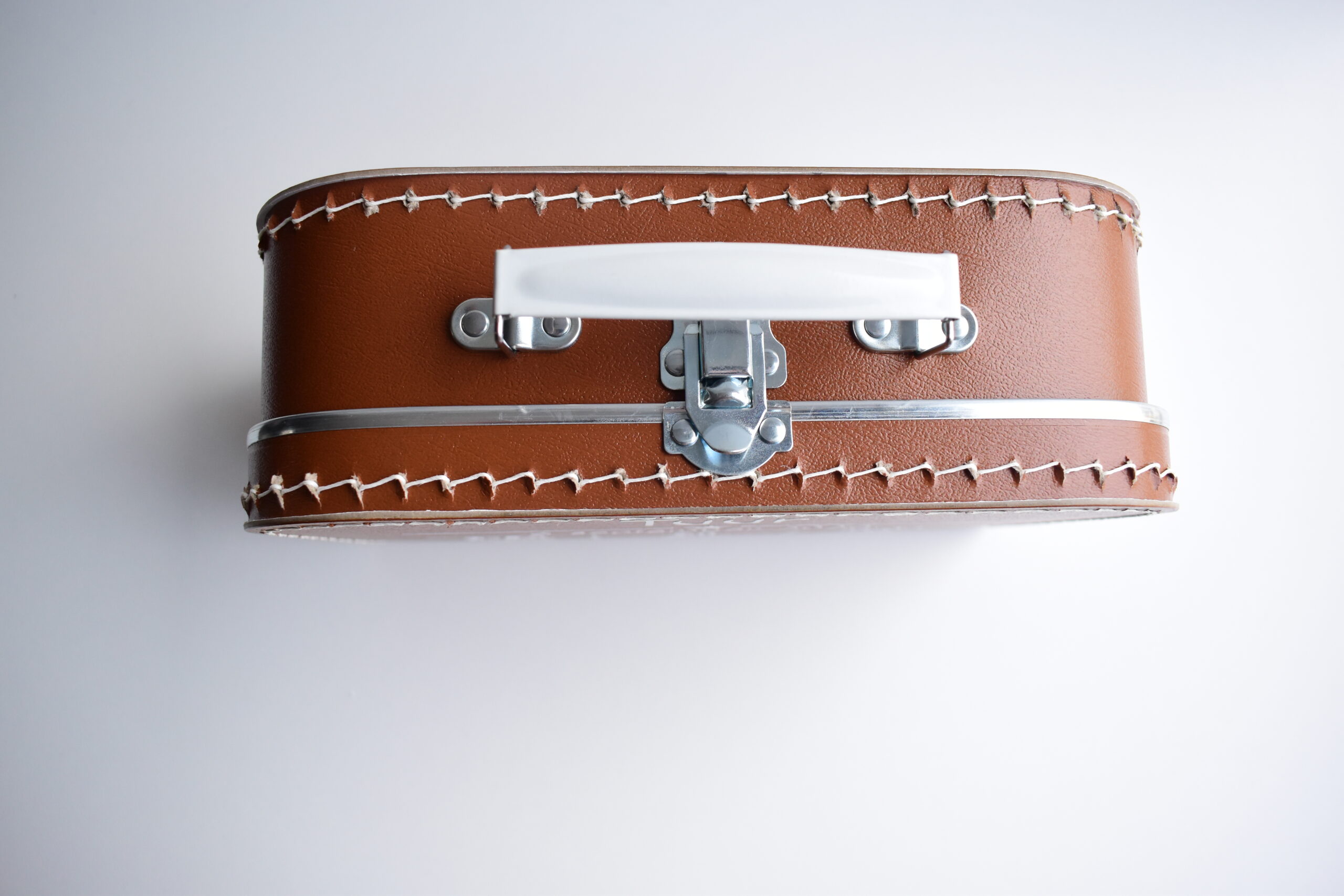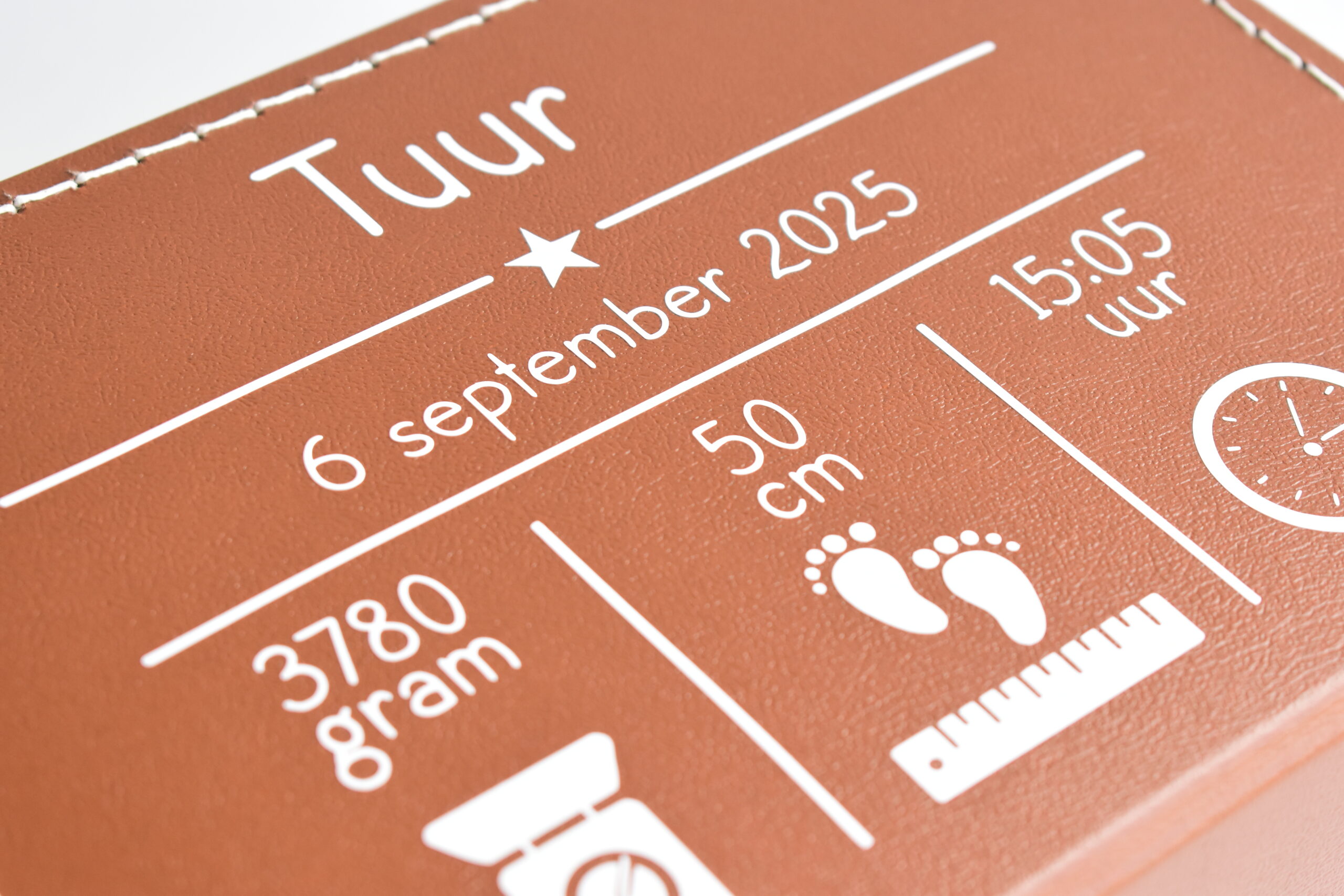 Dit mooie geboortekoffertje in het chique roestbruine kleurtje met witte stiksels, geeft een beetje een retrovibe.