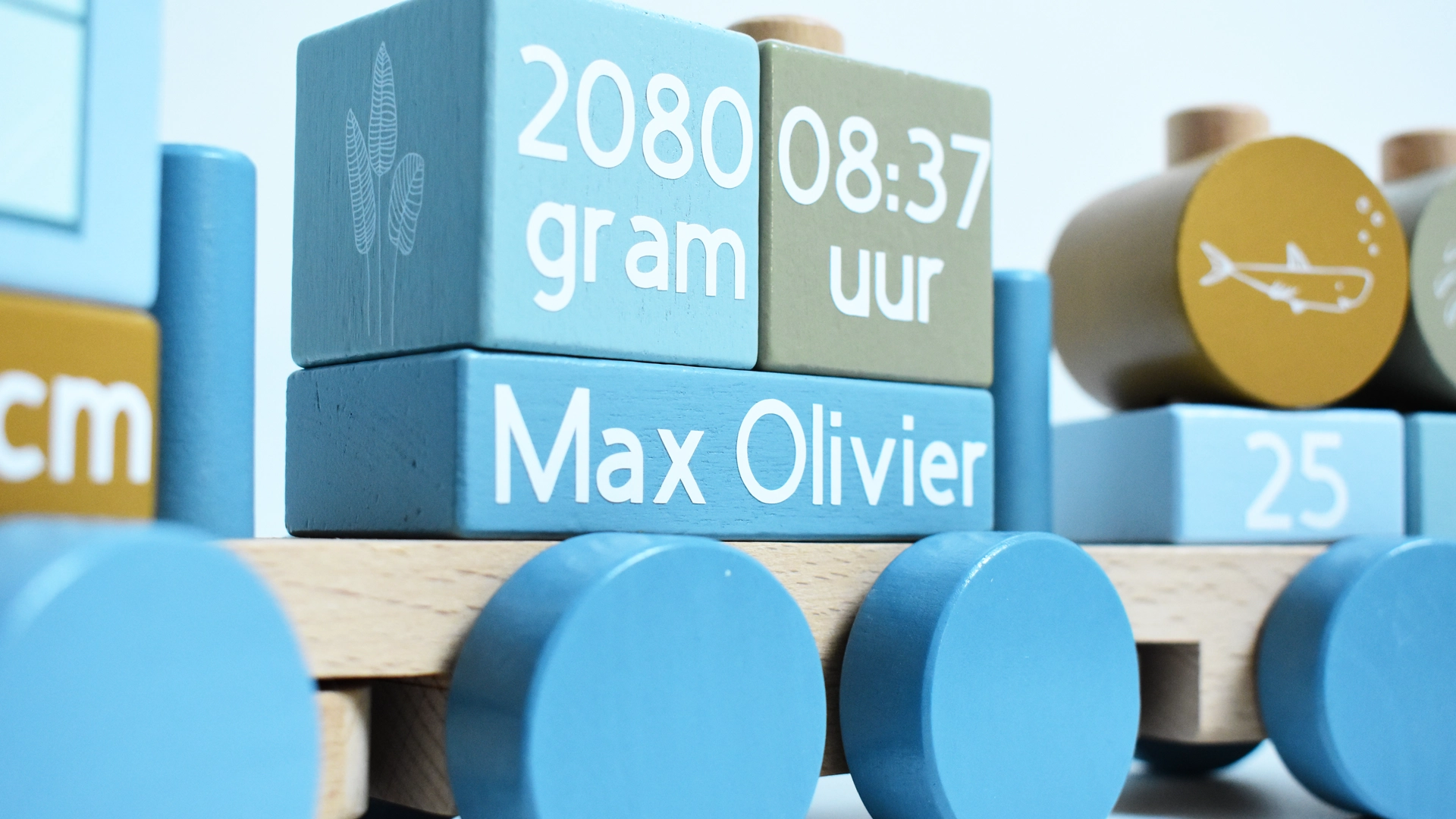 Gave blokkentrein van de Ocean lijn in prachtige blauwe en neutrale tinten van het merk Little Dutch, voorzien van de geboortegegevens van de baby! Een super leuk kraamcadeautje. Mooi om neer te zetten op het kamertje en later natuurlijk super leuk voor het kindje om mee te spelen! Voor dit originele cadeautje heb ik de naam, geboortedatum, het tijdstip en eventueel de lengte in centimeters van de baby nodig. Geef deze gegevens in het opmerkingenveld tijdens je bestelling door en ik verzorg de rest. Wil je het ook nog leuk ingepakt thuis ontvangen, dan pak ik het uiteraard met liefde en plezier voor je in. Dit dien je dan wel kenbaar te maken tijdens je bestelling, in het opmerkingenveld.